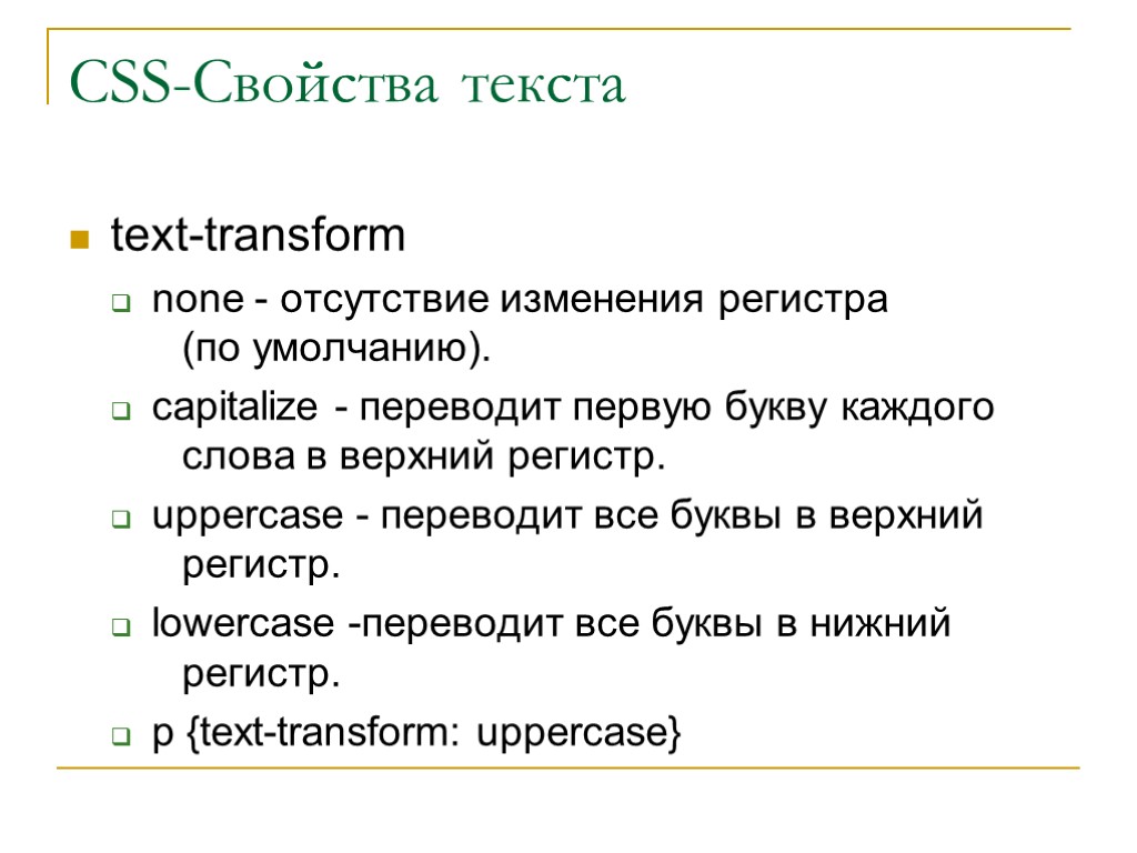 CSS-Свойства текста text-transform none - отсутствие изменения регистра (по умолчанию). capitalize - переводит первую букву каждого слова в верхний регистр. uppercase - переводит все буквы в верхний регистр. lowercase -переводит все буквы в нижний регистр. p {text-transform: uppercase}