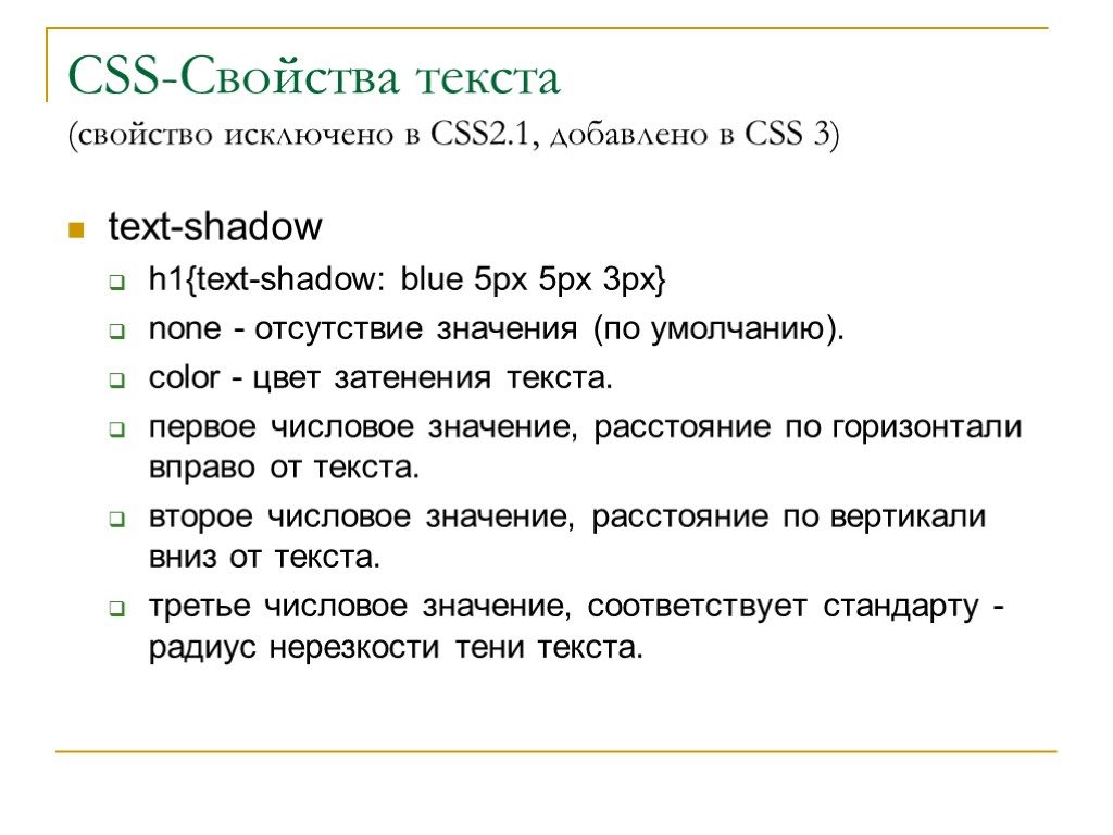 CSS-Свойства текста (cвойство исключено в CSS2.1, добавлено в CSS 3) text-shadow h1{text-shadow: blue 5px 5px 3px} none - отсутствие значения (по умолчанию). color - цвет затенения текста. первое числовое значение, расстояние по горизонтали вправо от текста. второе числовое значение, расстояние по вертикали вниз от текста. третье числовое значение, соответствует стандарту - радиус нерезкости тени текста.