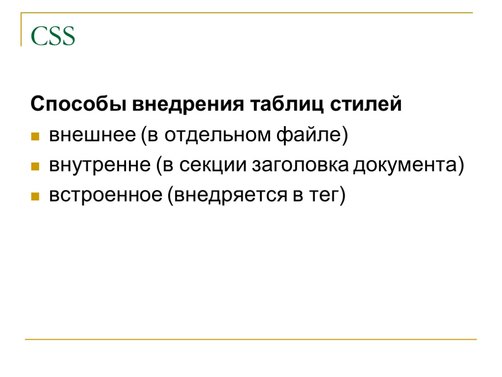 CSS Способы внедрения таблиц стилей внешнее (в отдельном файле) внутренне (в секции заголовка документа) встроенное (внедряется в тег)
