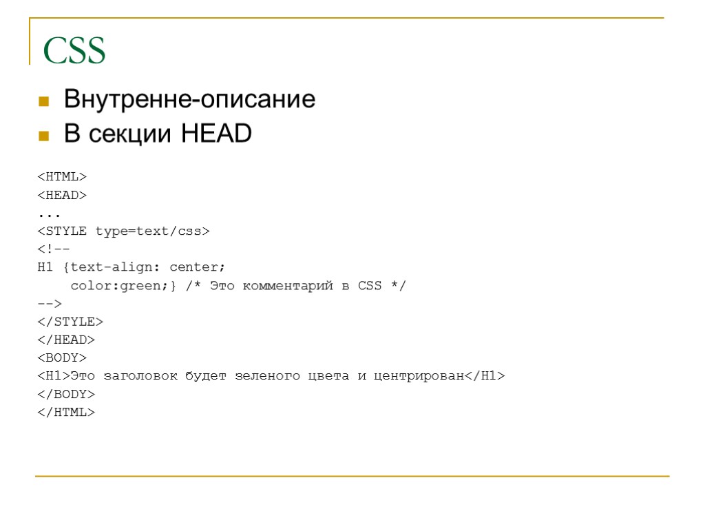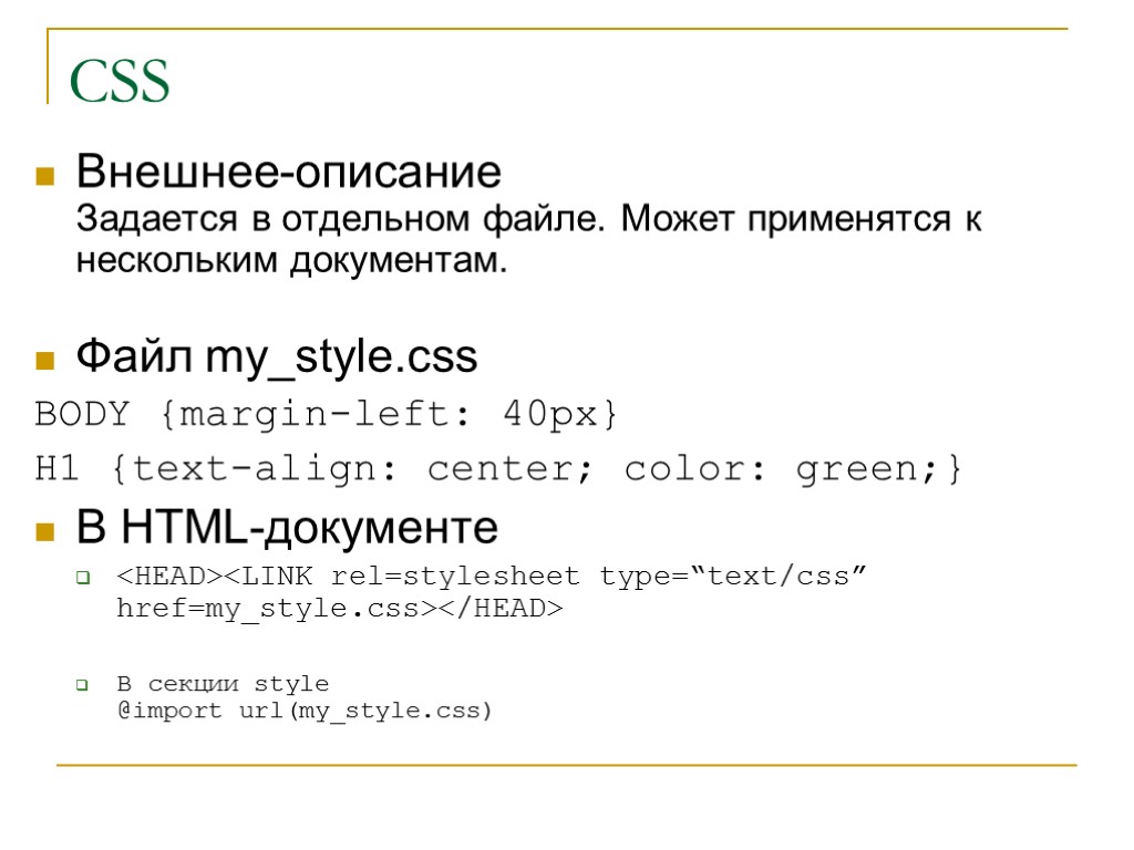 CSS Внешнее-описание Задается в отдельном файле. Может применятся к нескольким документам. Файл my_style.css BODY {margin-left: 40px} H1 {text-align: center; color: green;} В HTML-документе