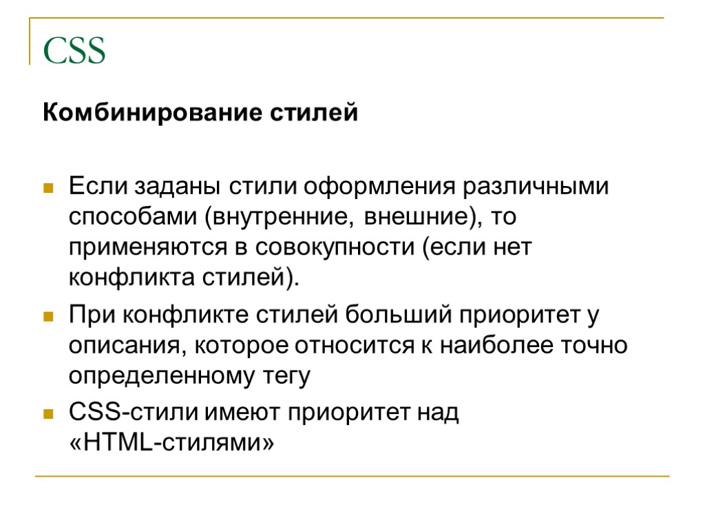 CSS Комбинирование стилей Если заданы стили оформления различными способами (внутренние, внешние), то применяются в совокупности (если нет конфликта стилей). При конфликте стилей больший приоритет у описания, которое относится к наиболее точно определенному тегу CSS-стили имеют приоритет над «HTML-стилями»