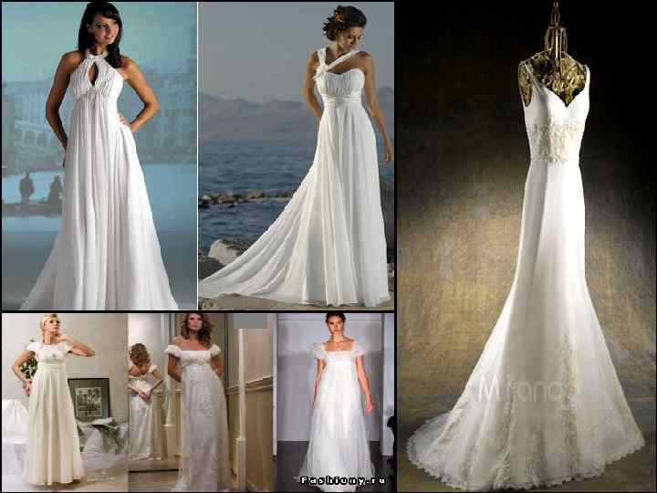 Особую популярность приобрели длинные свадебные платья в стиле ампир. Наряды в этом стиле шьют из шелка и шифона. Обувь выбирают на высоком каблуке или сандалии на плоской подошве. Прическа: волосы гладко причесаны, пробор четко посередине головы, на лоб спадают локоны.