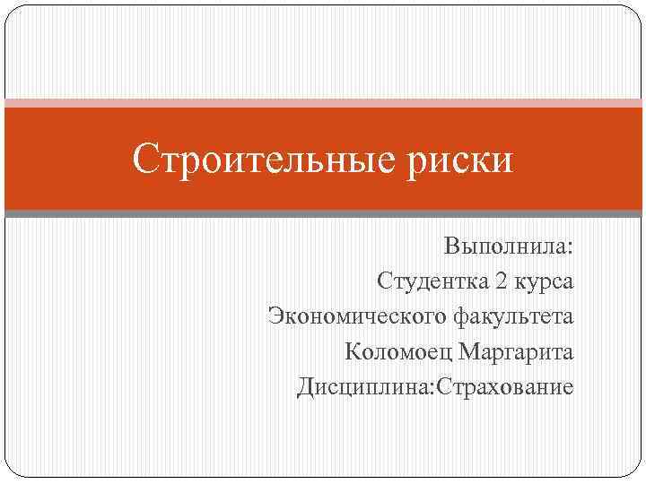 Cтроительные риски Выполнила: Студентка 2 курса Экономического факультета Коломоец Маргарита Дисциплина: Страхование
