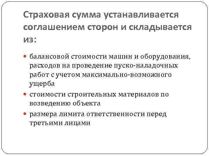 Страховая сумма устанавливается соглашением сторон и складывается из: балансовой стоимости машин и оборудования, расходов на проведение пуско-наладочных работ с учетом максимально-возможного ущерба стоимости строительных материалов по возведению объекта размера лимита ответственности перед третьими лицами