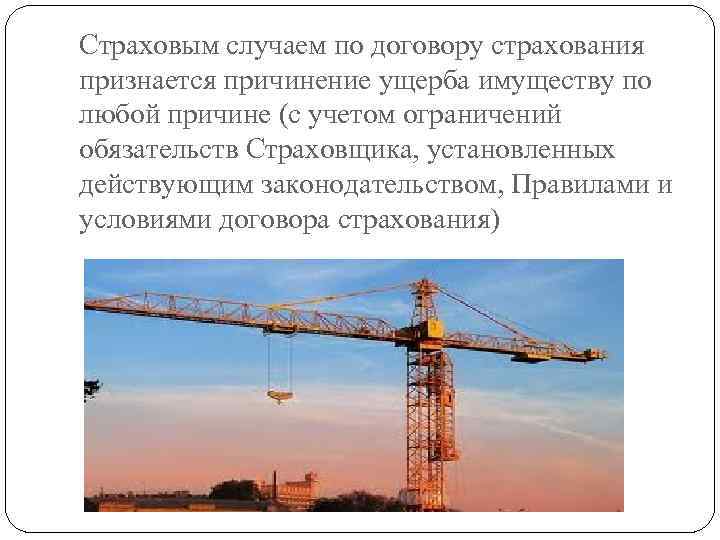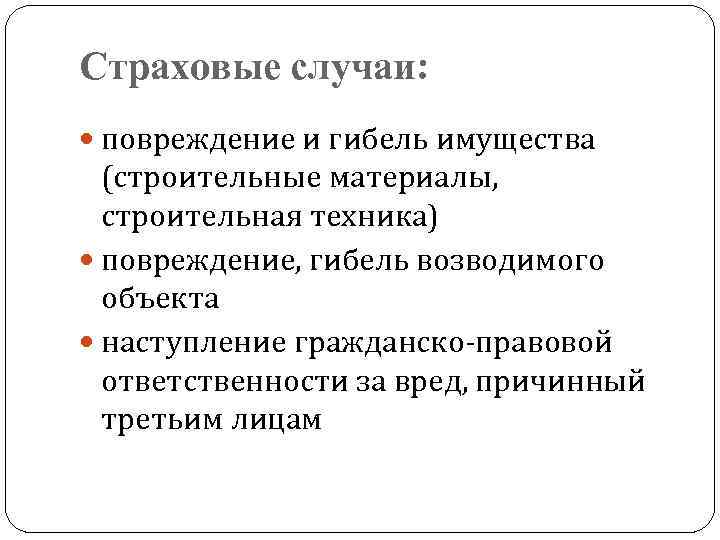 Страховые случаи: повреждение и гибель имущества (строительные материалы, строительная техника) повреждение, гибель возводимого объекта наступление гражданско-правовой ответственности за вред, причинный третьим лицам