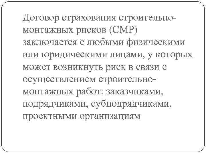 Договор страхования строительномонтажных рисков (СМР) заключается с любыми физическими или юридическими лицами, у которых может возникнуть риск в связи с осуществлением строительномонтажных работ: заказчиками, подрядчиками, субподрядчиками, проектными организациям
