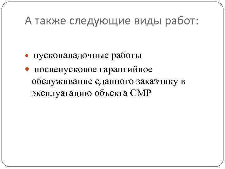 А также следующие виды работ: пусконаладочные работы послепусковое гарантийное обслуживание сданного заказчику в эксплуатацию объекта СМР