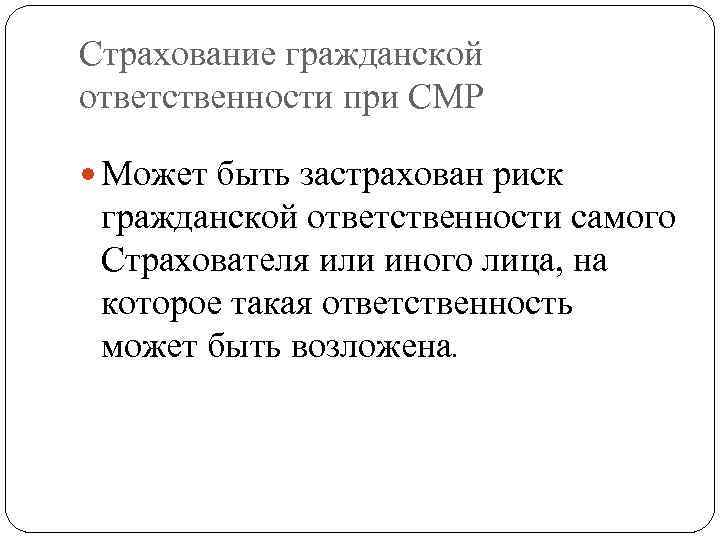 Страхование гражданской ответственности при СМР Может быть застрахован риск гражданской ответственности самого Страхователя или иного лица, на которое такая ответственность может быть возложена.
