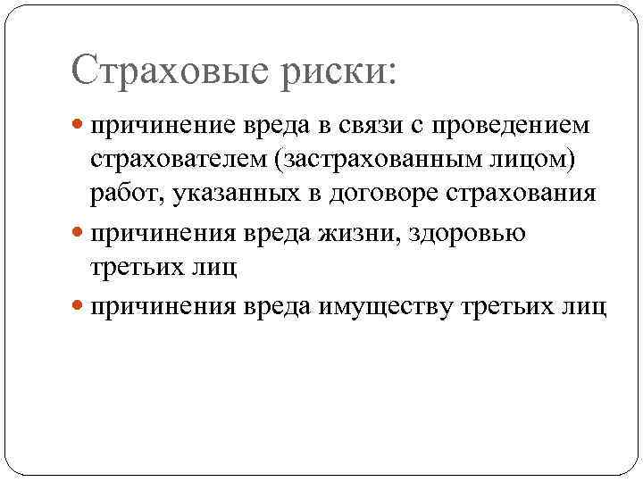 Страховые риски: причинение вреда в связи с проведением страхователем (застрахованным лицом) работ, указанных в договоре страхования причинения вреда жизни, здоровью третьих лиц причинения вреда имуществу третьих лиц