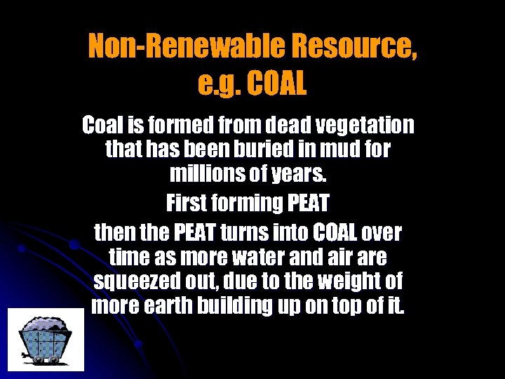 Non-Renewable Resource, e. g. COAL Coal is formed from dead vegetation that has been buried in mud for millions of years. First forming PEAT then the PEAT turns into COAL over time as more water and air are squeezed out, due to the weight of more earth building up on top of it.