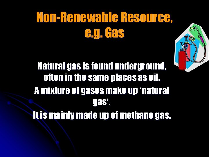 Non-Renewable Resource, e. g. Gas Natural gas is found underground, often in the same places as oil. A mixture of gases make up ‘natural gas’. It is mainly made up of methane gas.