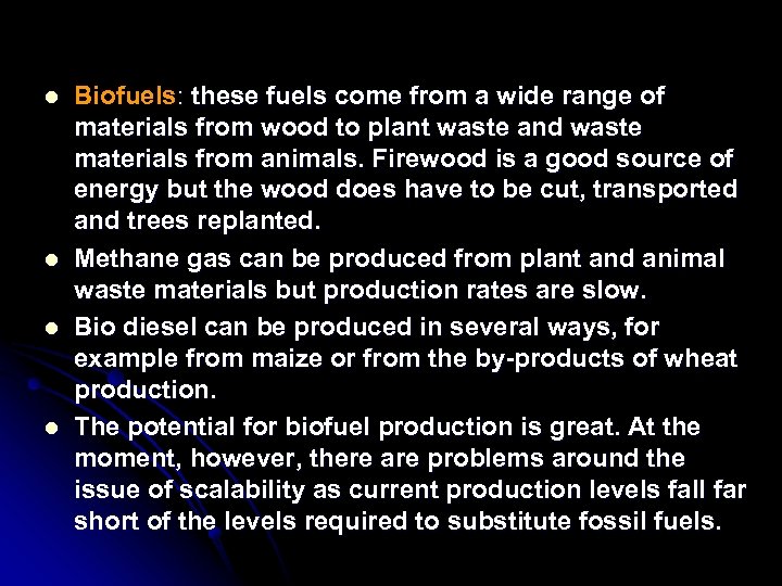 l l Biofuels: these fuels come from a wide range of materials from wood to plant waste and waste materials from animals. Firewood is a good source of energy but the wood does have to be cut, transported and trees replanted. Methane gas can be produced from plant and animal waste materials but production rates are slow. Bio diesel can be produced in several ways, for example from maize or from the by-products of wheat production. The potential for biofuel production is great. At the moment, however, there are problems around the issue of scalability as current production levels fall far short of the levels required to substitute fossil fuels.