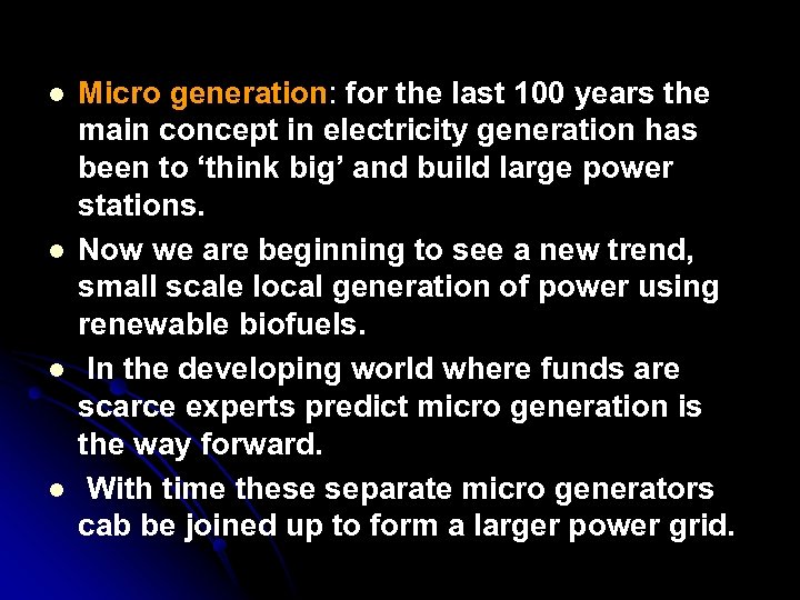l l Micro generation: for the last 100 years the : main concept in electricity generation has been to ‘think big’ and build large power stations. Now we are beginning to see a new trend, small scale local generation of power using renewable biofuels. In the developing world where funds are scarce experts predict micro generation is the way forward. With time these separate micro generators cab be joined up to form a larger power grid.