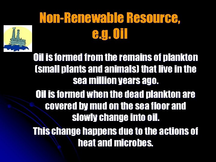Non-Renewable Resource, e. g. Oil is formed from the remains of plankton (small plants and animals) that live in the sea million years ago. Oil is formed when the dead plankton are covered by mud on the sea floor and slowly change into oil. This change happens due to the actions of heat and microbes.