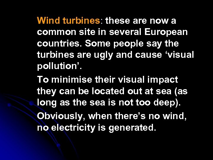 Wind turbines: these are now a : common site in several European countries. Some people say the turbines are ugly and cause ‘visual pollution’. To minimise their visual impact they can be located out at sea (as long as the sea is not too deep). Obviously, when there’s no wind, no electricity is generated.