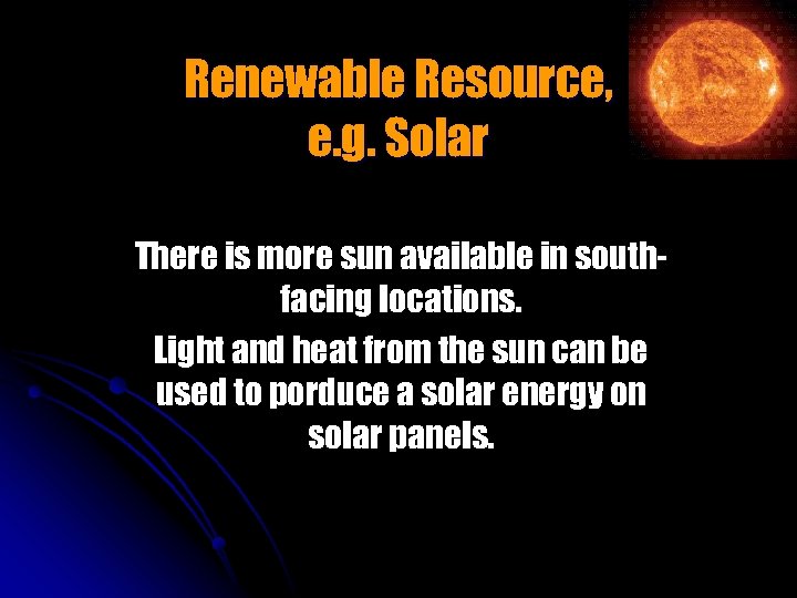 Renewable Resource, e. g. Solar There is more sun available in southfacing locations. Light and heat from the sun can be used to porduce a solar energy on solar panels.