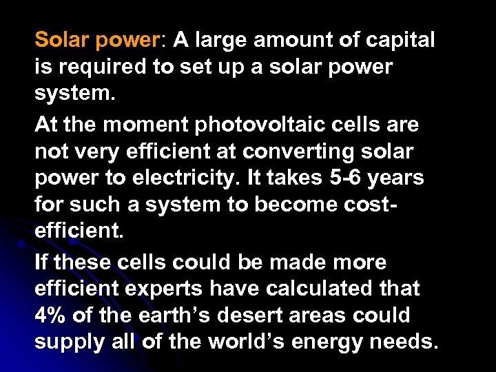 Solar power: A large amount of capital : is required to set up a solar power system. At the moment photovoltaic cells are not very efficient at converting solar power to electricity. It takes 5 -6 years for such a system to become costefficient. If these cells could be made more efficient experts have calculated that 4% of the earth’s desert areas could supply all of the world’s energy needs.