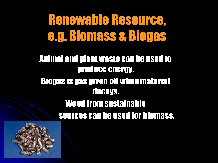 Renewable Resource, e. g. Biomass & Biogas Animal and plant waste can be used to produce energy. Biogas is gas given off when material decays. Wood from sustainable sources can be used for biomass.