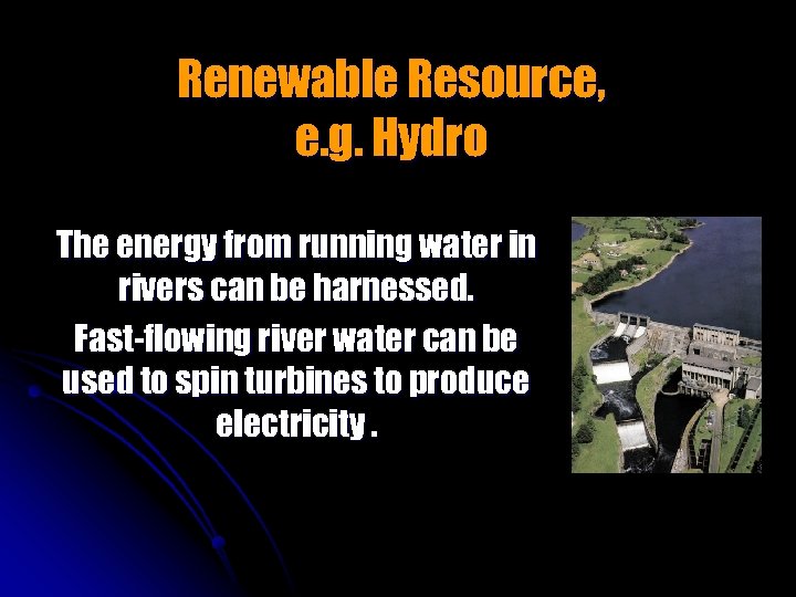 Renewable Resource, e. g. Hydro The energy from running water in rivers can be harnessed. Fast-flowing river water can be used to spin turbines to produce electricity.