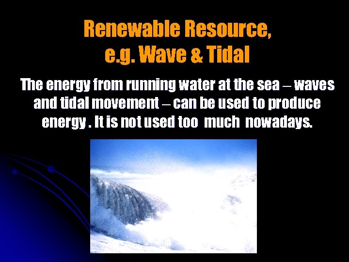 Renewable Resource, e. g. Wave & Tidal The energy from running water at the sea – waves and tidal movement – can be used to produce energy. It is not used too much nowadays.