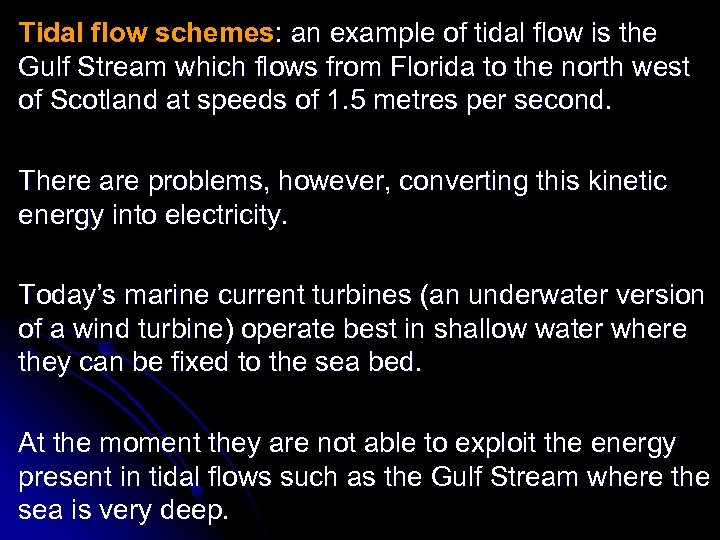 Tidal flow schemes: an example of tidal flow is the Gulf Stream which flows from Florida to the north west of Scotland at speeds of 1. 5 metres per second. There are problems, however, converting this kinetic energy into electricity. Today’s marine current turbines (an underwater version of a wind turbine) operate best in shallow water where they can be fixed to the sea bed. At the moment they are not able to exploit the energy present in tidal flows such as the Gulf Stream where the sea is very deep.