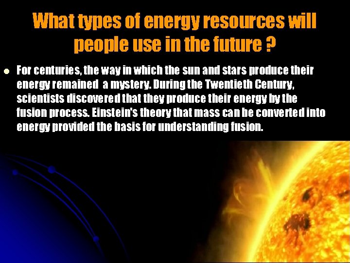 What types of energy resources will people use in the future ? l For centuries, the way in which the sun and stars produce their energy remained a mystery. During the Twentieth Century, scientists discovered that they produce their energy by the fusion process. Einstein's theory that mass can be converted into energy provided the basis for understanding fusion.