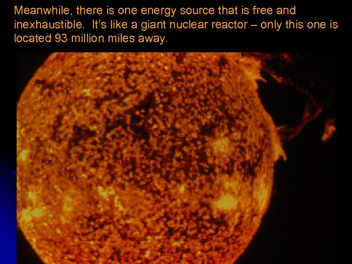 Meanwhile, there is one energy source that is free and inexhaustible. It’s like a giant nuclear reactor – only this one is located 93 million miles away. 25 Solar Wonders, © 2007 Florida Solar Energy