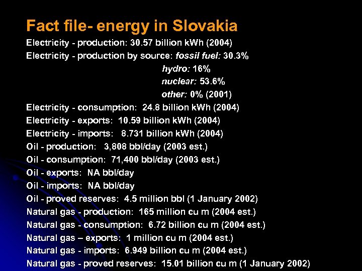 Fact file- energy in Slovakia Electricity - production: 30. 57 billion k. Wh (2004) Electricity - production by source: fossil fuel: 30. 3% hydro: 16% nuclear: 53. 6% other: 0% (2001) Electricity - consumption: 24. 8 billion k. Wh (2004) Electricity - exports: 10. 59 billion k. Wh (2004) Electricity - imports: 8. 731 billion k. Wh (2004) Oil - production: 3, 808 bbl/day (2003 est. ) Oil - consumption: 71, 400 bbl/day (2003 est. ) Oil - exports: NA bbl/day Oil - imports: NA bbl/day Oil - proved reserves: 4. 5 million bbl (1 January 2002) Natural gas - production: 165 million cu m (2004 est. ) Natural gas - consumption: 6. 72 billion cu m (2004 est. ) Natural gas – exports: 1 million cu m (2004 est. ) Natural gas - imports: 6. 949 billion cu m (2004 est. ) Natural gas - proved reserves: 15. 01 billion cu m (1 January 2002)