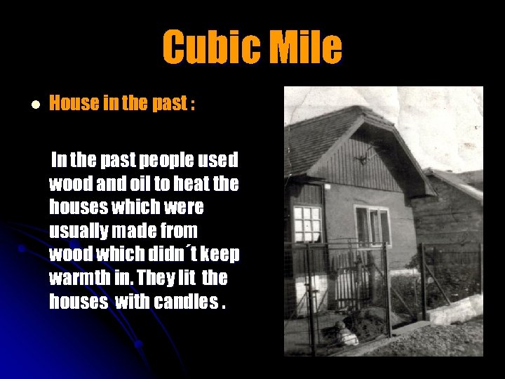 Cubic Mile l House in the past : In the past people used wood and oil to heat the houses which were usually made from wood which didn´t keep warmth in. They lit the houses with candles.