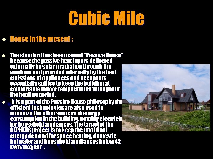 Cubic Mile l House in the present : l The standard has been named "Passive House" because the passive heat inputs delivered externally by solar irradiation through the windows and provided internally by the heat emissions of appliances and occupants essentially suffice to keep the building at comfortable indoor temperatures throughout the heating period. It is a part of the Passive House philosophy that efficient technologies are also used to minimize the other sources of energy consumption in the building, notably electricity for household appliances. The target of the CEPHEUS project is to keep the total final energy demand for space heating, domestic hot water and household appliances below 42 k. Wh/m 2 year". l