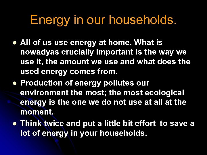 Energy in our households. l l l All of us use energy at home. What is nowadyas crucially important is the way we use it, the amount we use and what does the used energy comes from. Production of energy pollutes our environment the most; the most ecological energy is the one we do not use at all at the moment. Think twice and put a little bit effort to save a lot of energy in your households.