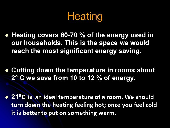 Heating l Heating covers 60 -70 % of the energy used in our households. This is the space we would reach the most significant energy saving. l Cutting down the temperature in rooms about 2° C we save from 10 to 12 % of energy. l 21⁰C is an ideal temperature of a room. We should turn down the heating feeling hot; once you feel cold it is better to put on something warm.