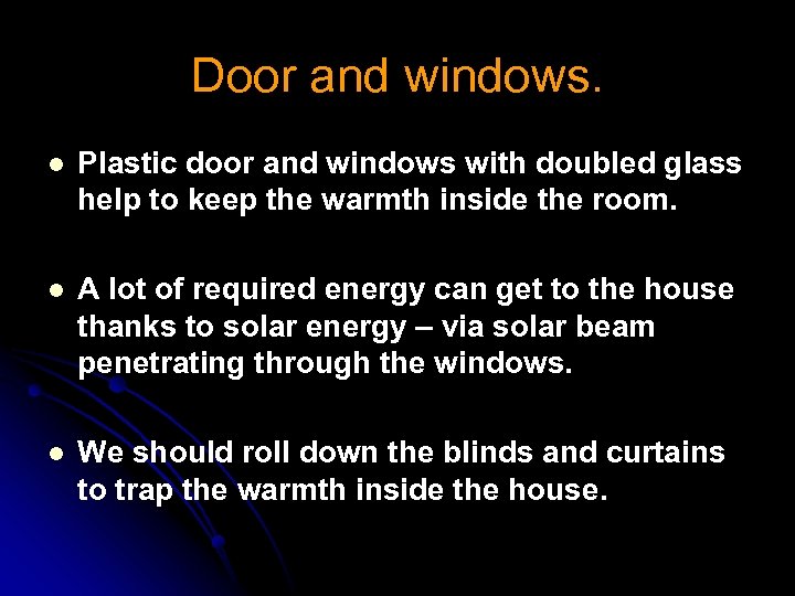 Door and windows. l Plastic door and windows with doubled glass help to keep the warmth inside the room. l A lot of required energy can get to the house thanks to solar energy – via solar beam penetrating through the windows. l We should roll down the blinds and curtains to trap the warmth inside the house.