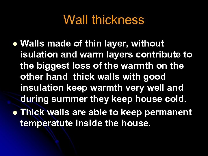 Wall thickness Walls made of thin layer, without isulation and warm layers contribute to the biggest loss of the warmth on the other hand thick walls with good insulation keep warmth very well and during summer they keep house cold. l Thick walls are able to keep permanent temperatute inside the house. l