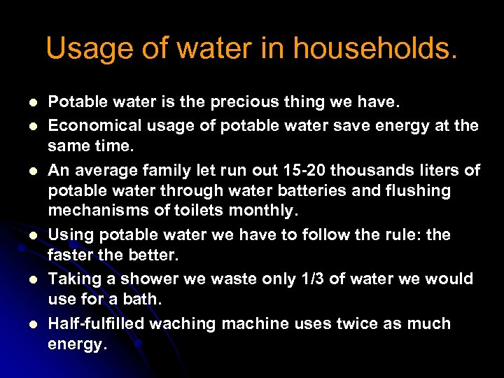 Usage of water in households. l l l Potable water is the precious thing we have. Economical usage of potable water save energy at the same time. An average family let run out 15 -20 thousands liters of potable water through water batteries and flushing mechanisms of toilets monthly. Using potable water we have to follow the rule: the faster the better. Taking a shower we waste only 1/3 of water we would use for a bath. Half-fulfilled waching machine uses twice as much energy.