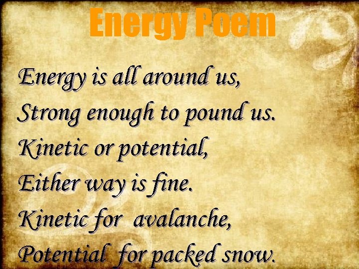 Energy Poem Energy is all around us, Strong enough to pound us. Kinetic or potential, Either way is fine. Kinetic for avalanche, Potential for packed snow.
