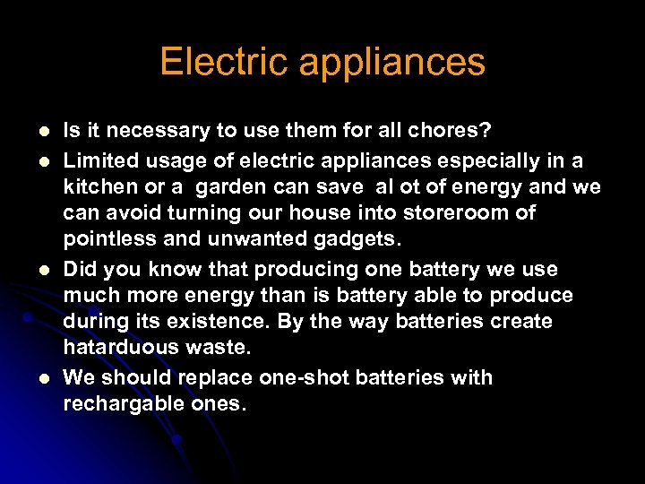 Electric appliances l l Is it necessary to use them for all chores? Limited usage of electric appliances especially in a kitchen or a garden can save al ot of energy and we can avoid turning our house into storeroom of pointless and unwanted gadgets. Did you know that producing one battery we use much more energy than is battery able to produce during its existence. By the way batteries create hatarduous waste. We should replace one-shot batteries with rechargable ones.