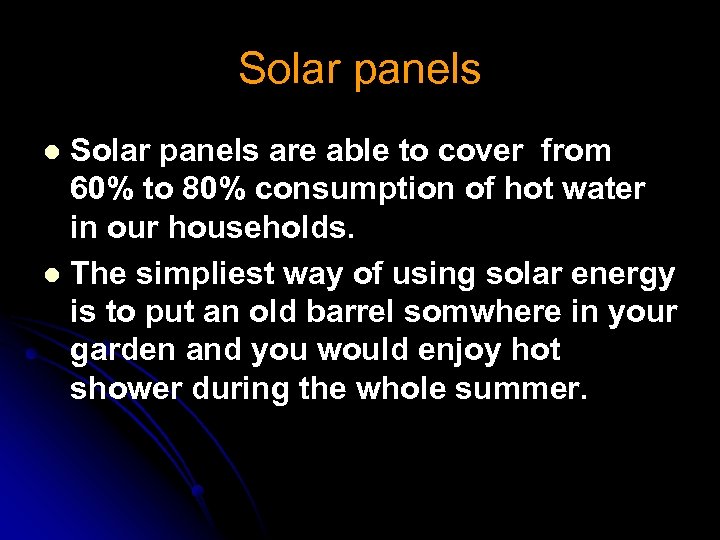 Solar panels are able to cover from 60% to 80% consumption of hot water in our households. l The simpliest way of using solar energy is to put an old barrel somwhere in your garden and you would enjoy hot shower during the whole summer. l