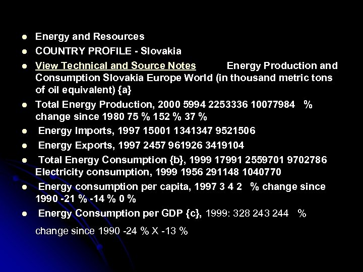l l l l l Energy and Resources COUNTRY PROFILE - Slovakia View Technical and Source Notes Energy Production and Consumption Slovakia Europe World (in thousand metric tons of oil equivalent) {a} Total Energy Production, 2000 5994 2253336 10077984 % change since 1980 75 % 152 % 37 % Energy Imports, 1997 15001 1341347 9521506 Energy Exports, 1997 2457 961926 3419104 Total Energy Consumption {b}, 1999 17991 2559701 9702786 Electricity consumption, 1999 1956 291148 1040770 Energy consumption per capita, 1997 3 4 2 % change since 1990 -21 % -14 % 0 % Energy Consumption per GDP {c}, 1999: 328 243 244 % change since 1990 -24 % X -13 %