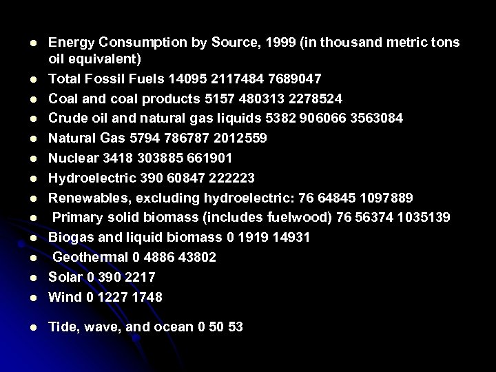 l Energy Consumption by Source, 1999 (in thousand metric tons oil equivalent) Total Fossil Fuels 14095 2117484 7689047 Coal and coal products 5157 480313 2278524 Crude oil and natural gas liquids 5382 906066 3563084 Natural Gas 5794 786787 2012559 Nuclear 3418 303885 661901 Hydroelectric 390 60847 222223 Renewables, excluding hydroelectric: 76 64845 1097889 Primary solid biomass (includes fuelwood) 76 56374 1035139 Biogas and liquid biomass 0 1919 14931 Geothermal 0 4886 43802 Solar 0 390 2217 Wind 0 1227 1748 l Tide, wave, and ocean 0 50 53 l l l