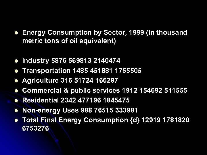 l Energy Consumption by Sector, 1999 (in thousand metric tons of oil equivalent) l Industry 5876 569813 2140474 Transportation 1485 451881 1755505 Agriculture 316 51724 166287 Commercial & public services 1912 154692 511555 Residential 2342 477196 1845475 Non-energy Uses 988 76515 333981 Total Final Energy Consumption {d} 12919 1781820 6753276 l l l