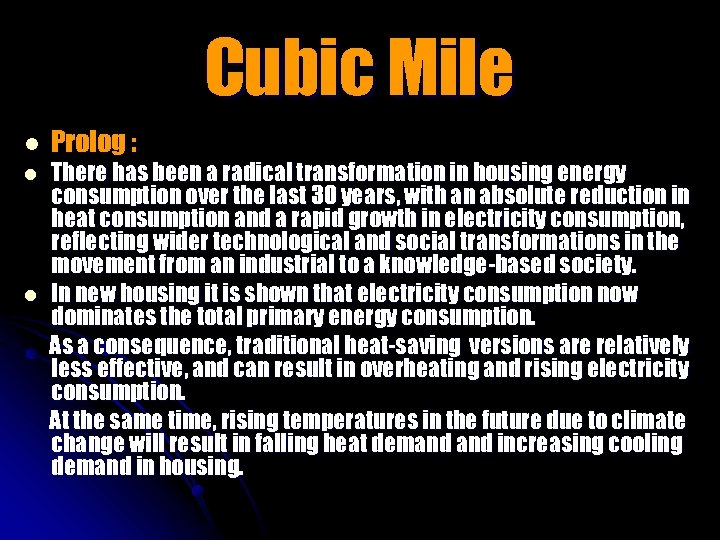Cubic Mile l l l Prolog : There has been a radical transformation in housing energy consumption over the last 30 years, with an absolute reduction in heat consumption and a rapid growth in electricity consumption, reflecting wider technological and social transformations in the movement from an industrial to a knowledge-based society. In new housing it is shown that electricity consumption now dominates the total primary energy consumption. As a consequence, traditional heat-saving versions are relatively less effective, and can result in overheating and rising electricity consumption. At the same time, rising temperatures in the future due to climate change will result in falling heat demand increasing cooling demand in housing.