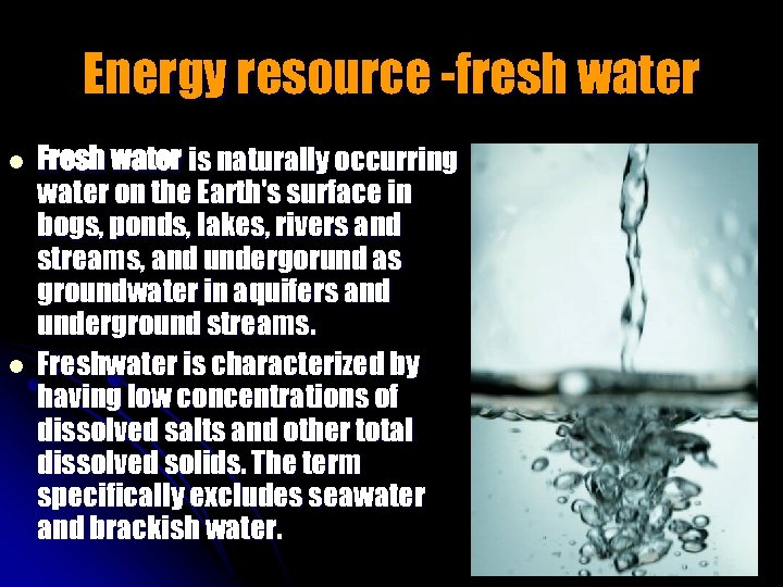 Energy resource -fresh water l l Fresh water is naturally occurring water on the Earth's surface in bogs, ponds, lakes, rivers and streams, and undergorund as groundwater in aquifers and underground streams. Freshwater is characterized by having low concentrations of dissolved salts and other total dissolved solids. The term specifically excludes seawater and brackish water.