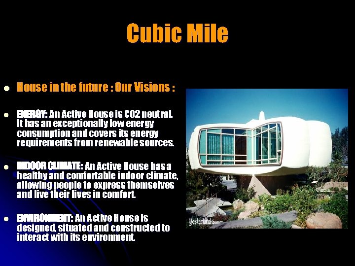 Cubic Mile l House in the future : Our Visions : l ENERGY: An Active House is CO 2 neutral. It has an exceptionally low energy consumption and covers its energy requirements from renewable sources. l INDOOR CLIMATE: An Active House has a healthy and comfortable indoor climate, allowing people to express themselves and live their lives in comfort. l ENVIRONMENT: An Active House is designed, situated and constructed to interact with its environment.