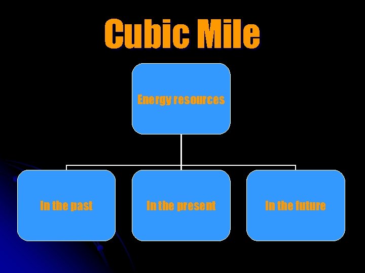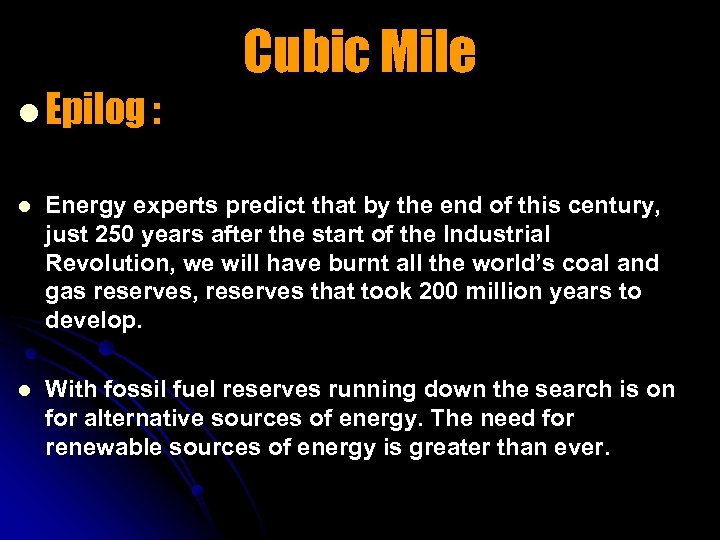 l Epilog : Cubic Mile l Energy experts predict that by the end of this century, just 250 years after the start of the Industrial Revolution, we will have burnt all the world’s coal and gas reserves, reserves that took 200 million years to develop. l With fossil fuel reserves running down the search is on for alternative sources of energy. The need for renewable sources of energy is greater than ever.