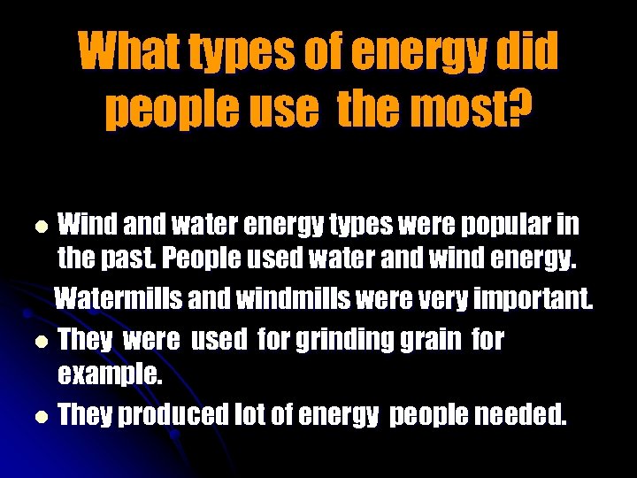 What types of energy did people use the most? Wind and water energy types were popular in the past. People used water and wind energy. Watermills and windmills were very important. l They were used for grinding grain for example. l They produced lot of energy people needed. l