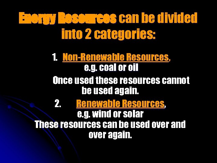 Energy Resources can be divided into 2 categories: 1. Non-Renewable Resources, e. g. coal or oil Once used these resources cannot be used again. 2. Renewable Resources, e. g. wind or solar These resources can be used over and over again.