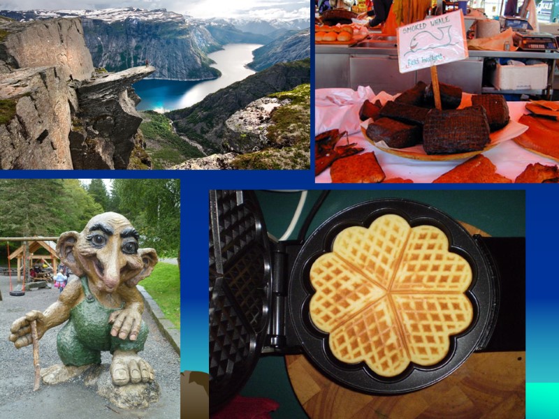 The 10 Most Famous Things about Norway Fjords Whale Meat (and other kinds of fish) Skiing (winter sport in mountains) Elk and Reindeer Coffee (kokekaffe, or ‘steeped coffee’) Waffles Trolls (sculptures) The Midnight Sun Stave Churches Vikings