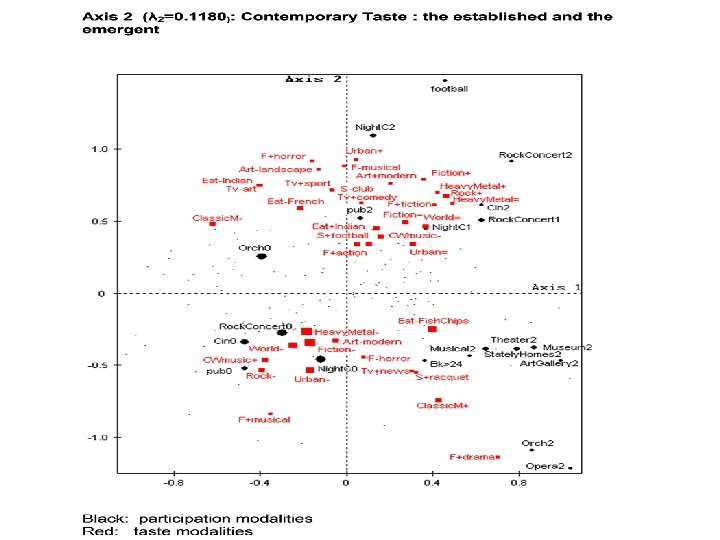 Multiple Correspondence Analysis • plotting people’s cultural preferences in Euclidian space • graphically represent an unusually wide range of cultural tastes and practices • method is ‘inductive’ and ‘descriptive’ and does not presuppose any particular ordering of practices will be found