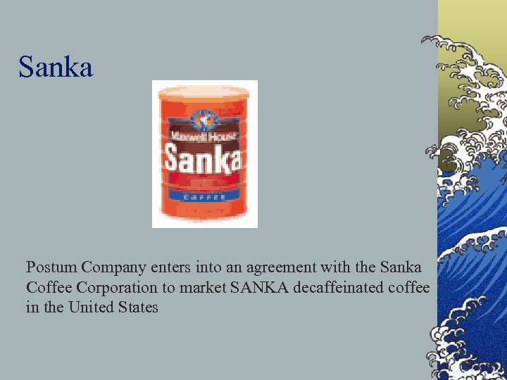 Sanka Postum Company enters into an agreement with the Sanka Coffee Corporation to market SANKA decaffeinated coffee in the United States